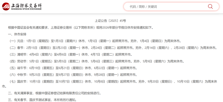 12月22日益配资,上海、深圳和北京三大证券交易所发布通知,对2026年部分节假日休市作出安排。根据安排,周末休市加上春节,A股在春节期间休市时间将长达10天。2月24日(大年初八)起开市。
