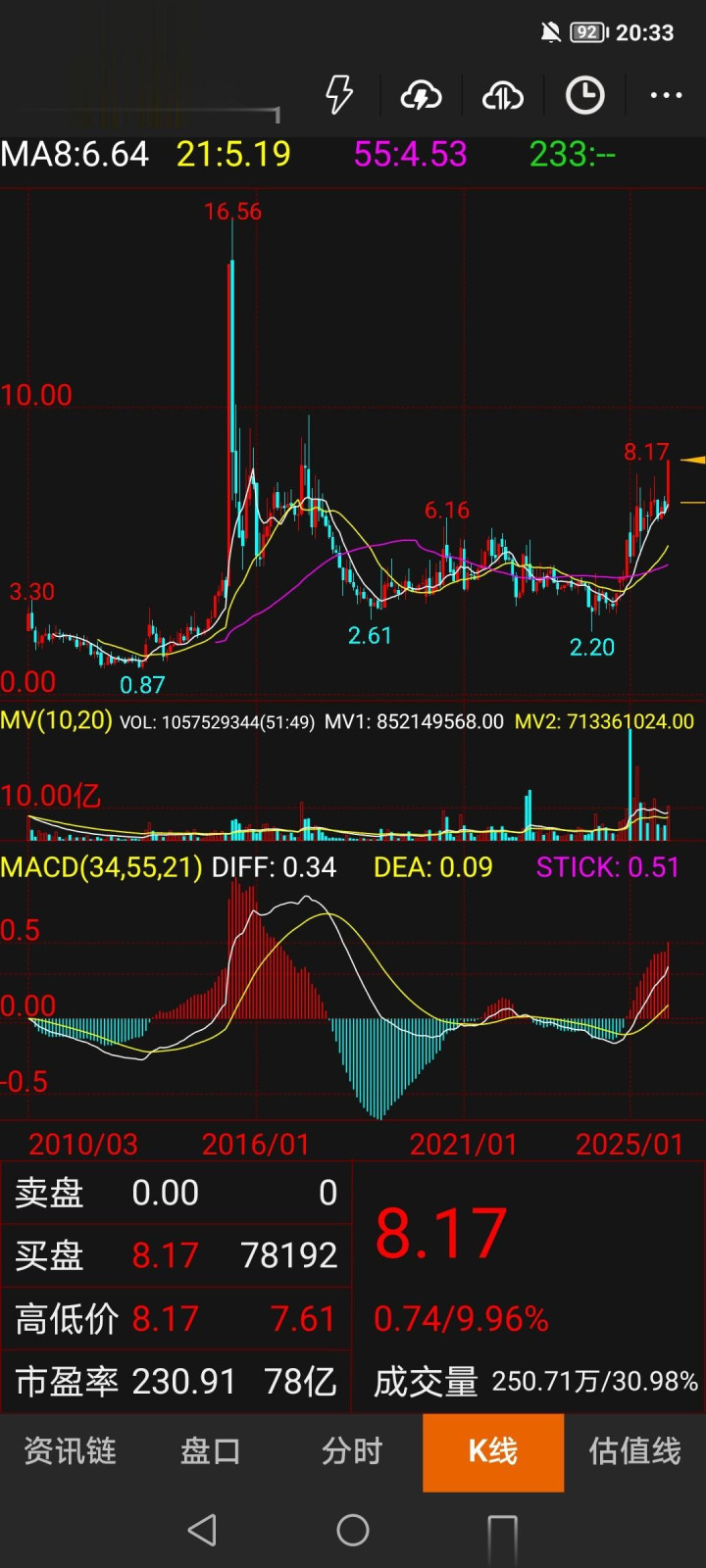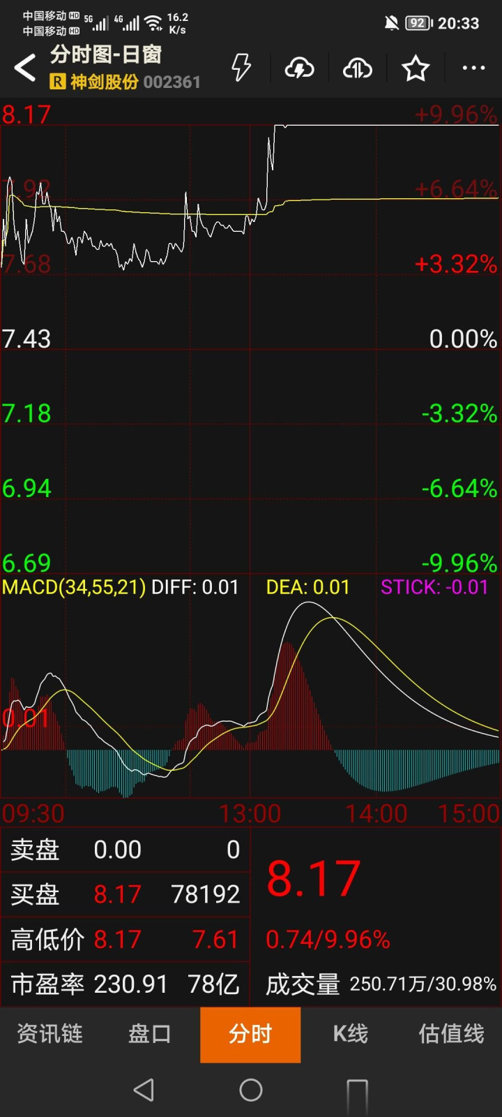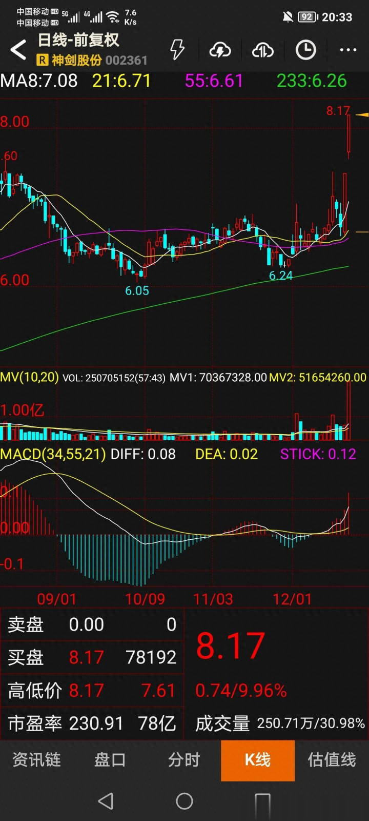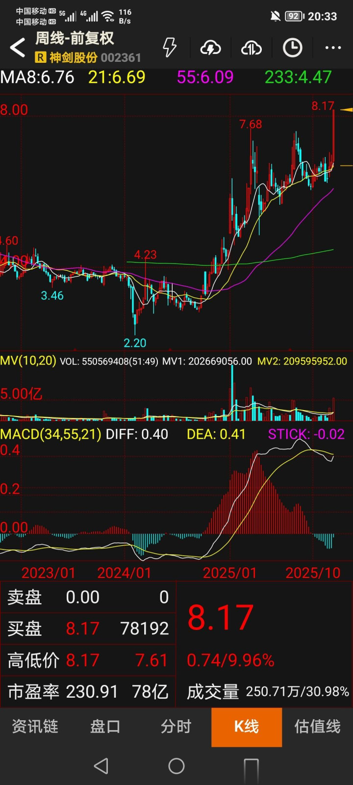 近期神剑股份换手率一度飙升至41.8%,意味着接近一半的流通股完成换手,多空博弈异常激烈,但最终多头力量占据主导,即便涨停板多次开板仍能强势回封,凸显承接盘的充足。从技术面看,MACD在0轴上方发散,20天线即将金叉30天线,周线MACD也有望实现水上金叉,技术形态支撑上涨趋势 。而连续涨停形成的赚钱效应,又吸引了短线“打板”资金持续接力,形成“连板-吸引资金-再连板”的正向循环。